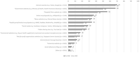 Among those who sought health information online, the top three sources were Internet searches (69%), followed by government websites (61%), and hospitals or clinic websites (51%). Compared to respondents with LL-HIO, a significantly larger proportion of respondents with HL-HIO utilised online platforms including government websites (68% vs. 50%, p < 0.001) and hospital or clinic websites (56% vs. 42%, p < 0.001) (Figure 2).