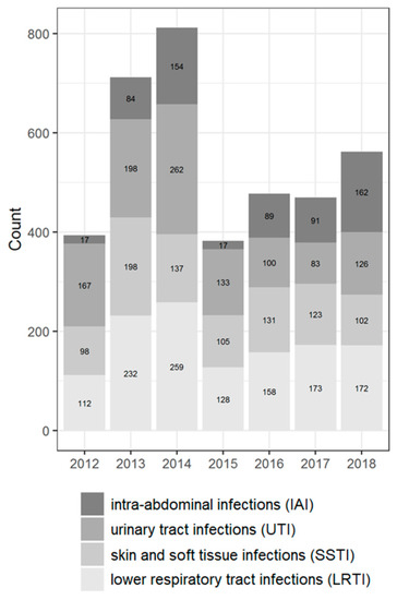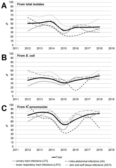 The Antimicrobial Testing Leadership and Surveillance (ATLAS) Program is being undertaken to evaluate the longitudinal in vitro activity of various antibiotic classes against significant clinical isolates [12,13] derived from hospitalized patients with complicated urinary tract infections (cUTI), complicated intra-abdominal infections (cIAI), complicated skin and soft tissue infections (cSSTI), lower respiratory tract infections (LRTI), as well as isolates recovered from blood specimens. In this paper, we report the results of cUTI, cIAI, cSSTI, blood, and LRTI from the ATLAS study for the surveillance period 2012–2018. In addition, the trends of antibiotic resistance in extended-spectrum β-lactamase (ESBL)-producing bacteria for different types of infections (community- or hospital-acquired) were also analyzed. This work was aimed at analyzing the trends of antimicrobial resistance of Enterobacteriaceae in Russia under the ATLAS program.