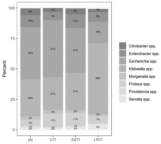 Among the two most prevalent genera, Klebsiella spp. was predominantly isolated from LTRI (49% of all Klebsiella spp. isolates), whereas Escherichia coli was isolated from UTI (38.2% of all Escherichia coli isolates) followed by LRTI (16.6% of all Escherichia coli isolates). The Enterobacter spp. was isolated more often from SSTI (30.4% of all Enterobacter isolates); the Proteus spp. isolates from UTI (35.8%); the Citrobacter spp. isolates from SSTI (30.3%); the Serratia spp. isolates from LRTI (54.6%); and Morganella isolates from UTI (36.5%).