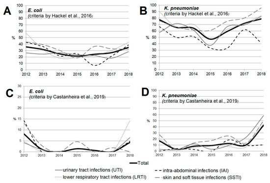 The dynamics of the percentage of multidrug-resistant strains among E. coli (A,C) and K. pneumoniae (B,D) isolates depending on location of the infection source according to the criteria proposed by Hackel et al. [14] (A,B) and Castanheira et al. [15] (C,D).