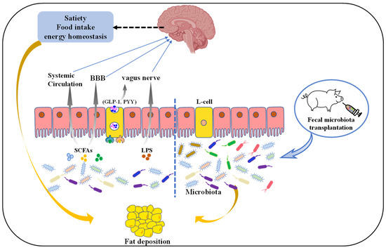 The mechanism of gut microbiota regulates pig fat deposition. Microbiota-derived metabolites such as SCFAs or lipopolysaccharide (LPS) affect satiety, food intake, or energy homeostasis directly via the vagus nerve (VN) or indirectly blood–brain barrier (BBB) and systemic circulation. L-cells are activated by these microbial metabolites through activation of different receptors, resulting in the production of gut hormones such as glucagon-like peptide-1 (GLP-1) and peptide YY (PYY). These intestinal hormones signal from the gut to the nucleus tractus solitarius in the brain via the VN and direct secretion into the circulatory system. Additionally, fecal microbiota transplantation (FMT), where fecal microbiota from a donor is transplanted into a recipient GI tract, has the potential to be an effective option to regulate fat deposition.
