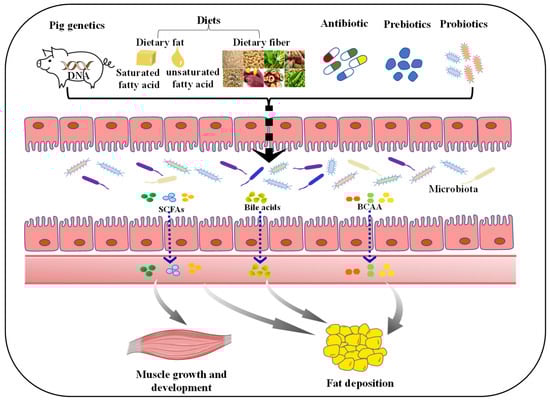 Like other farm animals and humans, the gastrointestinal tract of pigs contains trillions of commensal microorganisms, mainly bacteria, which constitute the gut microbiota and are closely associated with host physiological functions [4], feed efficiency, lipid metabolism, immune system development, and gut health [5,6,7,8]. Recently, gut microbiota have been considered as an important factor affecting complicated traits such as meat quality. Indeed, accumulating evidence suggests that gut microbiota regulate muscle development and fat deposition through metabolite–host interactions in humans [9,10], mice [11,12], and farm animals [4,6,13]. Notably, a variety of environmental factors, such as diet [14,15], stress, and medication [16], can govern the composition of the gut microbiota, thus providing a unique opportunity to improve the physiological condition of the host by regulating gut microbial communities, which may improve the production of high-quality meat. This review focuses mainly on how gut microbiota affect muscle growth, development, and fat deposition in pigs, as well as the factors influencing gut microbiota composition and diversity, providing a vital theoretical basis for future research.