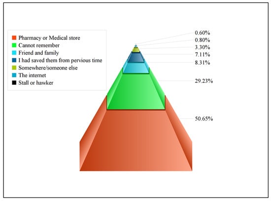 Results showed that most of the participants (35.4%) did not see doctors when they were sick because of lack of time. At the same time, 8.1% said that they do not implicitly trust doctors, and 15.2% of participants said that they do not have enough money for a doctor’s visit. In addition to this, 2.9% of participants stated that they face difficulties in communication with doctors, and 16.9% said that they face difficulties in reaching public health clinics or hospitals, or no transportation is available. The majority of participants who used antibiotics for themselves obtained their antibiotics from community pharmacies (50.6%), while 8.3% of participants obtained their antibiotics from a friend or family member. However, only (0.6%) of participants obtained their antibiotics from a stall or hawkers (Figure 1).