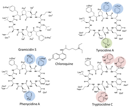 The chemical structures of gramicidin S (GS), tyrocidine A (TrcA), phenycidine A (PhcA), tryptocidine C (TpcC), and chloroquine (CQ).