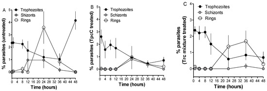 Distribution of trophozoite, schizont and ring parasite stages over time from 0 to 48 h following treatment of synchronized P. falciparum D10 cultures at trophozoite stage incubated without (control) (A), with 200 nM of TpcC (B) or 200 ng/mL Trc mixture (C). Each data point represents the mean ± SEM of parasite counts made within 8–13 regions on the microscope slide from two cultures of each treatment.