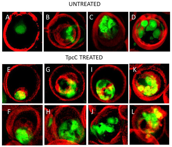 More detailed analysis of the SR-SIM images revealed more information on the TpcC action and possible targets. In some of the images taken for the treated samples, we observed abnormality in the packing or compactness of the chromatin as indicated by the SYTO9 nuclear staining (Figure 3). This could suggest that the change in DNA packing is the consequence of the TpcC activity. For P. falciparum there was a deformation of the nuclear distribution with change in the compact nature of the nuclear material leading to a mixture of intense and diffuse staining of the chromatin (Figure 3E–L). In addition, we also observed that, unlike the discrete segregated distribution of chromatin seen in the untreated schizont (Figure 3D), the treated parasites exhibited a loss of the uniform segregation and spherical morphology of the schizont chromatin (Figure 3J–L). This could indicate that some of the merozoites derived from this schizont will not be viable and explain the gradual decrease in parasitemia that was observed (Figure 1B). A similar effect on schizont chromatin morphology has been observed with GS and TrcA treatment in previous studies [36]. Apart from overt changes in parasite morphology, we also observed some abnormality in the shape and compactness of a dark structure assumed to be the hemozoin crystal in the treated samples (white arrows in Figure 3F,H). Unlike in the untreated sample, in some instances only observed in the treated samples there were dense dark dispersed and irregular elongated structures within the SYTO9 nuclear stain (Figure 3F,H) rather than more confined dark structures normally observed in the intra-erythrocyte trophozoites [39]. This suggested a compromise in the parasite’s ability to form a single hemozoin crystal and this could favor heme toxicity following the parasite’s digestion of hemoglobin [40]. Chloroquine has also been observed to cause the clumping of smaller hemozoin crystals [41,42,43].
