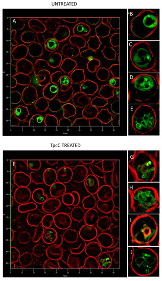 This malarial parasite morphological details observed were unlike any yet described, to the best of our knowledge. Notably, regular and circular shapes of the lipid structures were observed in normal untreated parasites (Figure 4A–E), with trophozoites having multiple circular structures (Figure 4B,C), sometimes associated with an intensely stained lipid droplets or bodies. The segregated pre-merozoite structures in the schizont shown in Figure 4E were clearly outlined by the neutral lipid stain. After treatment with TpcC the lipid structures were distorted and diffused (Figure 4F–H). There were also multiple intensely stained lipid droplets/bodies visible (Figure 4G,H,J), while some parasites did not show any straining (Figure 4F,I).