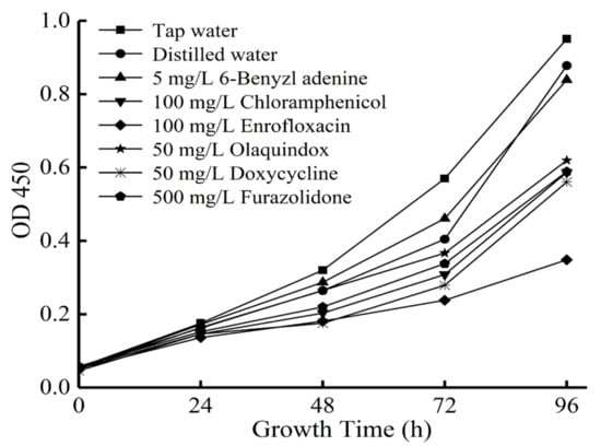 The inhibitory effects of antimicrobials on micro-organisms were investigated using OD450 values of circulating water. According to Figure 1, the largest OD450 value was found in the tap water group, which was related to the largest turbidity. Turbidity and OD value proved that growth and reproduction of micro-organisms existed in circulating water [28]. OD450 values of circulating water after 96 h in chloramphenicol, enrofloxacin, olaquindox, doxycycline and furazolidone groups were significantly lower than those of tap water, distilled water and 6-BA groups after 96 h (p < 0.05). It is suggested that antimicrobials have significant inhibitory effects on the growth of micro-organisms. In agriculture, antimicrobials are used to inhibit the growth of micro-organisms due to the antibacterial effect [18]. In terms of PGRs, the OD450 value of the 6-BA group was not significantly different to that in the tap water group (p > 0.05), which indicates that 6-BA had no obvious inhibitory effect on micro-organisms. As mentioned above, microbial growth existed in the cultivation of mung bean sprouts. The growth of micro-organisms is significantly inhibited by the addition of antimicrobials.