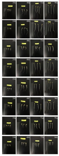 The sprouts were weighed in dark conditions with closed doors and windows after 24 h, 48 h, 72 h and 96 h, respectively. Total length, bud length and root length were measured after 24 h, 48 h, 72 h and 96 h, respectively. The sprouts were photographed using an iPhone 6 (Apple Inc., Cupertino, CA, USA) with black laboratory benches as the background and a ruler as the standard.
