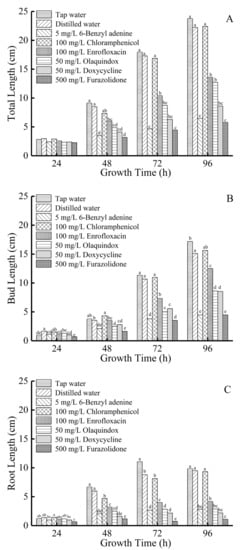 The total lengths, bud lengths and root lengths of the mung bean sprouts are shown in Table 2 and Figure 3. The total length, bud length and root length of mung bean sprouts in the tap water group were the longest of all groups. The total length, bud length and root length of the distilled water and chloramphenicol groups were not significantly different from those of the tap water group (p > 0.05). However, the bud lengths of the 6-BA, enrofloxacin, olaquindox, doxycycline and furazolidone groups were significantly shortened (p < 0.05). Compared with the tap water group, the root lengths of mung bean sprouts in the enrofloxacin, olaquindox, doxycycline and furazolidone groups were significantly decreased after 96 h (p < 0.05). The root lengths of mung bean sprouts in the enrofloxacin, olaquindox, doxycycline and furazolidone groups were not significantly different to the 6-BA group (p > 0.05).