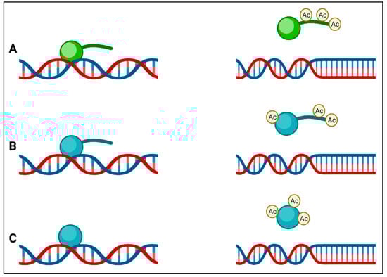 DNA is wrapped around core histone proteins, and these globular proteins have flexible tails protruding out from the nucleosome. Histone protein tails are subject to various post-translational covalent modifications, such as methylation, acetylation, and phosphorylation []. Histone acetyltransferases and deacetylases regulate the histone acetylation system. Histone deacetylation is usually associated with closed chromatin conformation and suppressing gene expression, whereas its acetylation will cause open chromatin conformation, increasing gene transcription []. On the other hand, histone methylation via arginine or lysine methyltransferases can facilitate or inhibit gene expression by regulating the DNA accessibility of transcription factors, gene silencing by blocking transcription, or gene overexpression by enabling the binding of transcription factors [].