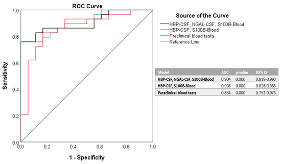 To further validate that our identified biomarkers in CSF (HBP and NGAL) and blood (S100B) are indeed good predictors for bacterial meningitis, we next conducted a logistic regression analysis for defining various association models. The models that best predicted the bacterial infection included the simultaneous use of biomarkers from both CSF and blood. Since the association of either HBP and NGAL in CSF with S100B in blood (model 1), or only the HBP value in CSF with S100B in blood (model 2) generated similar AUC values (0.904 vs. 0.908), it is clear that the finest predictors of bacterial meningitis among the newly investigated biomarkers would be the CSF levels of HBF and blood levels of S100B. If compared to an association model comprising the significant biomarkers identified in the paraclinical blood tests (listed in Table 4), our proposed models (1 and 2) yielded higher goodness-of-fit, as shown by the AUC values corresponding to the ROC curves (Figure 1).