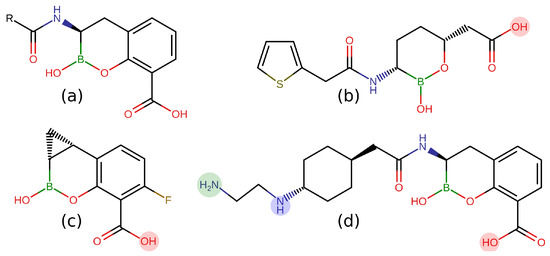 Lewis structures of the cyclic boronates in 2 dimensions: (a). precursor [13]; (b). Vaborbactam [13], carboxyl group deprotonated (charge −1) at pH 7.4; (c). QPX7728 [14], carboxyl group deprotonated (charge −1) at pH 7.4; (d). taniborbactam [15], carboxyl group deprotonated, secondary amine group protonated (total charge 0, zwitterionic) at pH 7.4 with probability 51% (tanibor0); in addition, the primary amine group can be also protonated with probability 34% at pH 7.4 (green circle, tanibor1, and total charge +1).