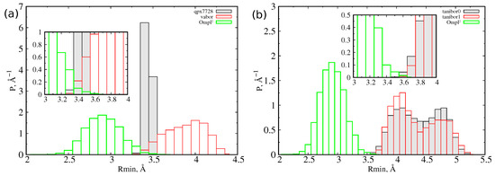 (a) Probability distribution function of the for QPX7728, vaborbactam, and OmpF. (b) Probability distribution of the for the two tautomers of taniborbactam and OmpF. In the inset, the overlap region of distributions is highlighted.