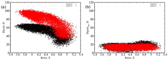 Scatter plot of dipole moment and minimum radius for taniborbactam0 (red) and taniborbactam1 (black) as sampled during MD simulations in water. (a) Total dipole moment versus minimum radius; (b) transversal dipole moment versus minimum radius.