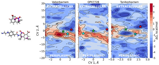 Vaborbactam shows an energy peak in the exact center of the FES, which is the excluded region. CV1 = 0 implies that the z-component of the vector shown in Figure 5 is zero; i.e., the antibiotic is oriented orthogonal to the diffusion axis. This could be hard for vaborbactam to achieve, because of the great steric hindrance this configuration would create. The red star in the basin in vaborbactam’s FES (Figure 5) corresponds to the first conformation in Figure 6. Here, vaborbactam enters in contact with the upper part of the constriction region (CR) through the interaction of the deprotonated carboxylic group with the basic ladder. This stable interaction is visited several times during the calculations, and the dipole moment (red arrow) is aligned to the transversal electric field of the pore. From here, vaborbactam slides toward CR, keeping the dipole moment aligned to the electric field. The system assumes a stable configuration in the middle of FES, identified by the green star in Figure 5; the corresponding green dipole in Figure 6 indicates the boronate ring is almost orthogonal to the diffusion axis. Now, group BOH also interacts with the basic ladder, and this interaction is important to keep the molecule near CR. For this conformation, an important step is to cross the CR with the thiophene ring, while the BOH group keeps the interaction with the basic ladder. Finally, the interaction between vaborbactam’s amide-NH and Asp-113 allows the molecule to overcome CR (cyan star in Figure 5, cyan dipole in Figure 6). The increase in steric hindrance is compensated by the alignment of the dipole moment with the electric field. In the mechanism, the thiophene ring is involved in the crossing mechanism, although it does not interact directly with CR.