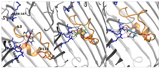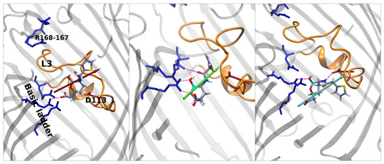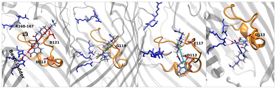 Regarding taniborbactam, we simulated only the zwitterionic tautomer, tanibor0 (see Figure 1d). We saw that this molecule possesses a size larger than the other two CBs (Figure 2); however, it was accompanied by a larger dipole moment, (Figure 4). Furthermore, this molecule has secondary amine groups that can effectively interact with the acidic L3 loop. Indeed, the low values of energy obtained in the barrier are also the result of this peculiarity. In Figure 5, we observe a first stable region in the extracellular side of the pore, above the barrier (red star). Figure 8 shows that also taniborbactam prefers to enter CR with the deprotonated carboxylic group. This group interacts with the basic ladder while the secondary amine group interacts with the upper part of L3, specifically Asp-121. From this configuration, the system moves to the central basin in Figure 5 (green star) with a rotation of the boronate ring with the carboxylic group as a pivot, just as observed for QPX7728. This conformation has a bigger MPA, but this is fully compensated by a large number of interactions. In particular, the oxygen of the BOH group creates a hydrogen bond with the basic ladder (Arg-42), while the secondary amine group performs the same with the backbone of the L3 residue Gly-119. Finally, the system reaches the final conformation, depicted with a cyan star. Here again, the interaction of BOH with Asp-113 takes place. This conformer shows that, to cross the barrier, the molecule has to momentary align the dipole against the electric field. The direct passage of the molecule from the red to the cyan state is also possible: The molecule only has to slide, as observed with vaborbactam. Taniborbactam is peculiar, and the presence of the large energy minimum in the middle of the FES is also peculiar (Figure 5, which is created by the antibiotic trying to cross the CR in the opposite direction, from trans to cis. This is visible from the last conformer in Figure 8. The interactions with the basic ladder and Asp-113 (in particular with the BOH group) are strong and create a deep affinity site for taniborbactam. However, the conformer’s dipole is not perfectly aligned to the electric field, and BLI’s orientation has a large steric hindrance that prevents taniborbactam from crossing CR in the wrong direction.