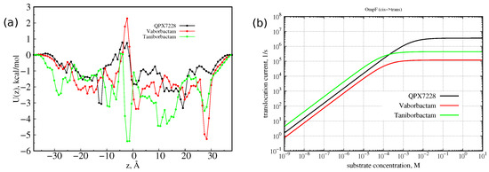 From the one-dimensional FES, it is also possible to predict the current of diffusing molecules versus the external gradient concentration. At a low substrate concentration, one can neglect the interaction between the substrate molecules. Then, diffusion is described by the linear 1D Smoluchowski equation, and the diffusion current is proportional to the substrate concentration gradient, as given by a Kramers-type integral formula [40]. As performed previously [30], the high substrate concentration condition was treated with a two-state Markov model [40]; we used value of 1 nm/ns for the effective diffusion constant. This model assumes that, at the maximum, one particle at a time may occupy the channel. It can describe both the linearity with the concentration and the saturated behavior of the particle translocation regime. The current of molecules as a function of gradient concentration is reported in Figure 9. Because of the small barrier shown by the three molecules, the current at 1 µM concentration is a few thousand molecules per second, larger than the value measured for avibactam [41], having a dipole similar to QPX7728 and larger size. The molecule with the highest current is taniborbactam, followed by QPX7728 and vaborbactam, following the trend of the increasing central barrier. The high affinity of taniborbactam with OmpF is also visible in Figure 9b. Its current saturates already at 100 μM, at 1 mM vaborbactam, and then at almost 10 mM does QPX7228. To note, these concentration values are larger than the typical one expected around bacteria.