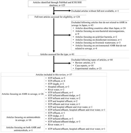 The literature search identified 125 articles. We excluded 1 article because the full-text publication was unavailable (Figure 1), and after reviewing the full text of the remaining 124 articles, we excluded another 43 articles that were not related to AMR in sewage in Japan because they described review articles (n = 24) or focused on non-bacterial microorganisms (n = 9), acid-fast bacteria (n = 2), disinfectant resistance (n = 1), livestock wastewater (n = 3), or environmental AMR that are not related to sewage (n = 4). We further excluded review articles (n = 5), clinical case reports (n = 18), and experimental studies (n = 21). The remaining 37 articles were included in the review and categorized into articles on AMR or antimicrobials; in addition, they were further categorized into articles on influent, effluent, and sludge in STPs, hospital effluent, or river water (Figure 1).