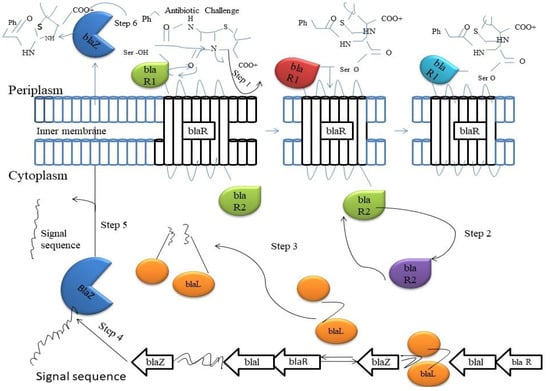 The upregulation of the Bla enzymes occurs when the two-component signaling system comes into contact with β-lactam antibiotics. A molecule of β-lactam antibiotic binds to active-site serine of the BlaR1 enzyme on the outside of outer membrane (Step 1). A conformational change occurs that releases the BlaR2 on the inside of the cellular envelop (Step 2). BlaR2 cleaves Blar1 of the DNA to allow for the transcription of downstream resistance genes (Step 3). The β-Lactamase BlaZ is produced from downstream genes (Step 4). BlaZ is transported out the cell, and the signal sequence is cleaved off the protein (Step 5). The BlaZ β-lactamase starts hydrolyzing incoming antibiotics (Step 6).