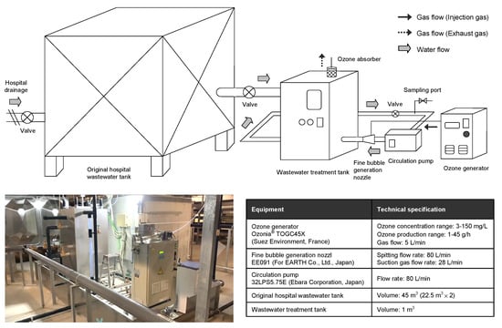 Schematic representation of the batch ozone treatment system implemented in a hospital facility. The picture shows the appearance of the advanced hospital wastewater treatment system equipped with the ozone treatment system that was tested in this study. The technical specifications of the equipment used in the system are shown in detail.