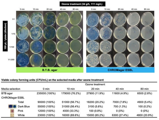 Isolation of bacteria from ozone-treated wastewater samples on B.T.B. agar and CHROMagar ESBL. An aliquot (100 µL) of ozone-treated wastewater sample was spread on the agar plate at the indicated dilution. Colony forming units (CFU/mL) were determined at the appropriate dilution for each time-point of ozone treatment. A colony on CHROMagar ESBL plate exhibited variable pigmentation, namely dark blue, pink, or white.