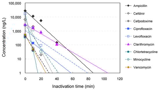 The higher concentrations of antimicrobials were consistent with those previously reported from other countries [,,]. The removal of antimicrobials detected in hospital wastewater by ozone treatment is summarized in Figure 3. The results show that ozone treatment reduced the residual antimicrobials in the wastewater over time, with a 96–100% removal of all targeted antimicrobials at 40 min after the treatment. The removal rate of cefdinir, levofloxacin, chlortetracycline, and vancomycin reached 90% within 10 min after the treatment, suggesting that these components are rapidly removed by ozone treatment. The removal rates of cefpodoxime, ciprofloxacin, and minocycline were 69% (cefpodoxime), 73% (ciprofloxacin), and 54% (minocycline) at 10 min after the start of treatment, and the removal rate of all components reached over 99% at 20 min after the treatment. On the contrary, ampicillin and clarithromycin were detected (20–22%) at 20 min after the start of the treatment, but the removal rate reached 96–99% after 40 min. These results suggest that ozone treatment can effectively remove antimicrobials in hospital wastewater in a short time.