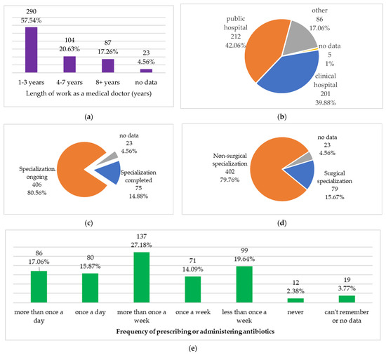 Professional characteristics of the study group: (a) length of work as a medical doctor; (b) main workplace; (c) specialization status; (d) type of specialization; (e) frequency of prescribing or administering antibiotics.