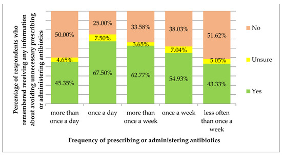 Percentage of respondents who remembered receiving any information about avoiding unnecessary prescribing or administering or dispensing of antibiotics, by the frequency of prescribing or administering antibiotics.