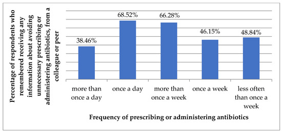 Percentage of respondents who remembered receiving information about avoiding unnecessary prescribing or administering or dispensing of antibiotics from a colleague or peer, by the frequency of prescribing or administering antibiotics.