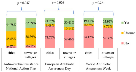 Percentage of respondents who were aware/unaware of whether their country had a national action plan on antimicrobial resistance, who had/had not heard of European Antibiotic Awareness Day, and who had/had not heard of World Antibiotic Awareness Week, by respondents’ place of residence. p for chi-square test.