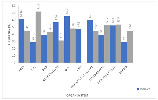 In terms of different practices, organ systems, and their antibiotic associate, it was found that in Jamaica, amoxicillin-clavulanic acid, a popular broad-spectrum antibiotic, was commonly used to treat skin, musculoskeletal, and reproductive conditions; while the trimethoprim–sulfamethoxazole combination was used for both gastrointestinal tract and the central nervous system infections (Figure 4). Amoxicillin-clavulanic acid proved to be a favorite among veterinarians. More than 49% of the respondents reported its use for skin, respiratory, musculoskeletal, genitourinary, reproductive, and sepsis conditions. It should be noted that, according to the data collected, no antibiotics were used on the central nervous system in Trinidad (Figure 4).