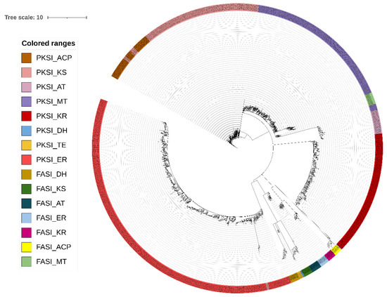 The Hidden Markov Models for each of the PKS I domains (acyltransferase (AT), acyl carrier proteins (ACP), enoyl reductase (ER), ketoreductase (KR), ketosynthase (KS), methyltransferase (MT), dehydratase (DH), and thioesterase (TE)) were downloaded from the Pfam database, version 33.1 [75]. The models were used to find protein sequences containing these domains with HMMER 3.3.2 (hmmsearch with --cut_tc option “trusted cutoff (TC)”) [76]. Sequences with a score greater than 40 and an E-value below 10−4 were selected and aligned using MAFFT v7.453 [77]. The alignments were manually curated, and the phylogenetic tree was built with IQ-TREE, multicore version 1.6.12, with the best-fit model WAG + F + R5, which was chosen according to the Bayesian Information Criterion [78,79]. The tree visualization was conducted using the iTOL tool [80].