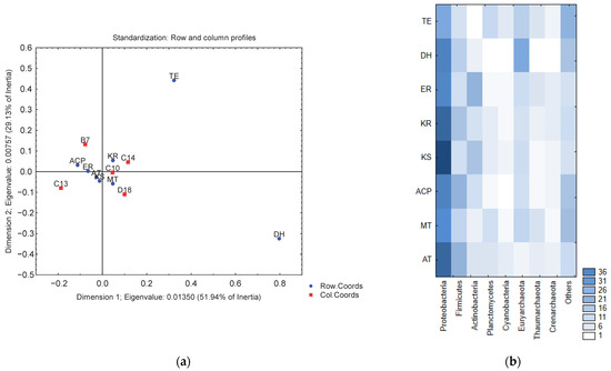 (a) Correspondence analysis between PKS I domains and metagenomes (red squares: metagenomes; blue dots: PKS I domains). (b) Representation of PKS I domains by relevant taxonomic groups.