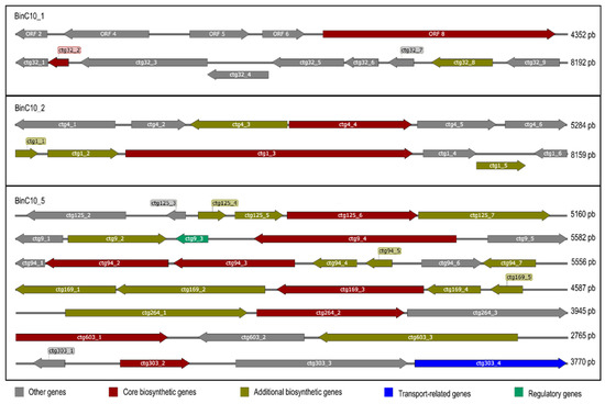 Biosynthetic clusters detected by antiSMASH bacterial version 6.0 in the BinC10_1, C10_2, and C10_5. The arrows presented within each open reading frame indicate the direction of translation for each gene. The type of product detected by AntiSMASH is presented above each core biosynthetic gene. Contig number: ctg; RiPP: ribosomally synthesized and post-translationally modified peptides; RRE: RiPP recognition element; NRPS: nonribosomal peptide synthetases; T3PKS: type III PKS.