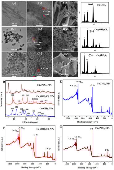 Characterization of copper-based nanomaterials. TEM (A-1), HR-TEM (A-2), SEM (A-3) and EDS (A-4) image of Cu(OH)2 nanowires; TEM (B-1), HR-TEM (B-2), SEM (B-3), and EDS (B-4) image of Cu3(PO4)2·3H2O nanosheets; TEM (C-1), HR-TEM (C-2), SEM (C-3), and EDS (C-4) image of copper oxychloride nanoparticles. XRD pattern of Cu(OH)2 nanowires, Cu3(PO4)2·3H2O nanosheets, and Cu4(OH)6Cl2 nanoparticles (D). XPS survey spectra of Cu(OH)2 nanowires (E), Cu3(PO4)2·3H2O nanosheets (F), and Cu4(OH)6Cl2 nanoparticles (G).