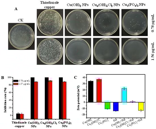 There are many kinds of copper-based nanoparticles, including pure metallic Cu NPs, copper oxide nanoparticles (CuO NPs), copper sulfide nanoparticles (CuS NPs), and biosynthetic copper-based nanoparticles []. These copper NPs are promising materials in the management of infectious and communicable diseases in the field of biological medicine []. Although these nanoparticles have been widely used in the control of plant fungal diseases, few studies have been conducted on their use against plant bacterial diseases. In fact, copper-containing nanoparticles have good inhibitory activity against both Gram-negative and Gram-positive bacteria, which gives them great prospects for applicability in the field of plant bacterial disease prevention. However, we need to consider the constraints of the type of nanomaterials selected: the effectiveness of disease control, preparation cost, and environmental effects. Cu(OH)2 and Cu4(OH)6Cl2 are both important varieties of copper-based pesticides with high market shares with low environmental risk when applied rationally. Furthermore, as a novel copper-based nanomaterial, Cu3(PO4)2·3H2O nanosheets have been applied in the control of plant fungal diseases; moreover, phosphorus-containing nanoparticles are beneficial to plant growth [,]. The preparation of the three kinds of nanoparticles is relatively easy without adding surfactant or using high-temperature aging, and industrialization is readily achievable. In addition, Figure S10 shows that the Cu4(OH)6Cl2 dispersion has the best colloidal stability and without precipitation in 1 h, while the Cu3(PO4)2·3H2O dispersion with the worst colloidal stability was completely precipitated in 1 h. Although it did not completely precipitate within 1 h, the solution of Cu(OH)2 nanowires became unstable. The zeta potential vs. time of the nanoparticles solutions further confirmed the above results (Figure S11). The preparation of Cu3(PO4)2·3H2O nanosheets required heating at high temperature, and the zeta potential of the water-dispersed solution had a low absolute value, indicating that the nanoparticles tended to aggregate in water. These factors make the practical application of Cu3(PO4)2·3H2O nanosheets in agriculture disadvantageous.