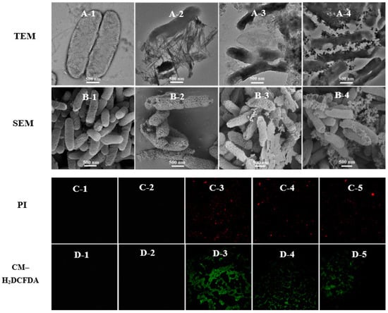 The interaction between the bacteria and nanoparticles. TEM and SEM images of Psa cells exposed to PBS (A-1,B-1), Cu(OH)2 nanowires (A-2,B-2), Cu3(PO4)2·3H2O nanosheets (A-3,B-3), and Cu4(OH)6Cl2 nanoparticles (A-4,B-4) for 8 h with a concentration of 50 μg/mL. Fluorescence images of Psa cells incubated with PI or CM–H2DCFDA after being exposed to PBS (C-1,D-1), thiodiazole copper (C-2,D-2), Cu(OH)2 nanowires (C-3,D-3), Cu3(PO4)2·3H2O nanosheets (C-4,D-4), and Cu4(OH)6Cl2 nanoparticles (C-5,D-5) for 8 h with concentration of 50 μg/mL.