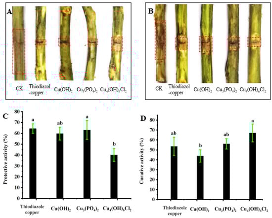 Control efficacies of copper-based nanomaterials and thiodiazole copper towards kiwifruit bacterial canker under controllable greenhouse conditions at 200 μg/mL. Protective activities (A,C); therapeutic activity (B,D). A one-way ANOVA with an LSD multiple comparison test was used to determine significance across all the treatments. Values in each panel followed by different letters are significantly different at p < 0.05.
