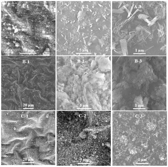 The distribution of Cu(OH)2 nanowires (A-1–A-3), Cu3(PO4)2·3H2O nanosheets (B-1–B-3), and Cu4(OH)6Cl2 nanoparticles (C-1–C-3) on the surface of kiwifruit leaves.