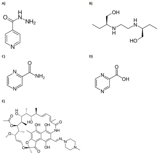 Structures of anti-tuberculous drugs reviewed in this manuscript: (A) Isoniazid, (B) Ethambutol, (C) Pyrazinamide, (D) Pyrazinoic acid, (E) Rifampin.