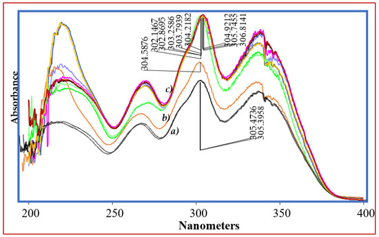The chromatographic conditions for separation of impurities and DPs from VEL were optimized using gradient chromatographic system. First of all, the detection wavelength was studied on UV-Visible spectrophotometer and all the solutions 10 µg mL−1 were scanned from 200 nm to 400 nm. As the chemical structures of all impurities are closely similar to that of VEL, so the similar UV absorbance spectrum and absorption maxima 305 ± 3 nm were obtained (Figure 4). The optimum wavelength 305 nm was selected as suitable wavelength for simultaneous analysis of all DPs and IMPs. Now, the selection of the chromatographic conditions appropriate for separation of DPs and impurities having similar structure was a big challenge. The performance of different stationary phases i.e., Octyl Silica C8 (Waters), Octadecyl Silica C18 (Waters) and phenyl-hexyl (Accucore) columns was compared using same mobile phase with same gradient programs. The separation of composite reference solution containing all IMPs and DPs were studied using combination of different buffers ranging from pH 1.2 to 8.0 with methanol or acetonitrile as organic modifiers. Using C8 analytical column, the resolution of ingredients was quite difficult, and the impurities were not resolved from VEL at any pH described above. The resolution of all ingredients at acidic pH over C18 and phenyl-hexyl analytical columns was good, however the retention time of VEL and two DPs was more than 20 min. To achieve good resolution of each component in minimum run time, C18 analytical column was selected for further optimization. The gradient program for elution of acidic mobile phase A (0.1% TFA) with B (menthol) was adjusted to get optimal resolution in run time less than 15 min. Good separation was achieved (Figure 5 and Figure 6) using gradient elution: 0–2 min: 10% B, 2–6 min: 10–50% B, 6–12 min: 50–90% B, 12–13 min: 90–10% B, and 13–15 min: 10% B at a flow rate of 0.8 mL/min over C18 symmetry analytical column equilibrated at 30 °C. To validate the optimized conditions, all the performance parameters of the analytical method i.e., accuracy and recovery, precisions and repeatability, specificity and linearity were evaluated according to the prescribed limits and criteria of ICHQ1A (R2) guidelines.