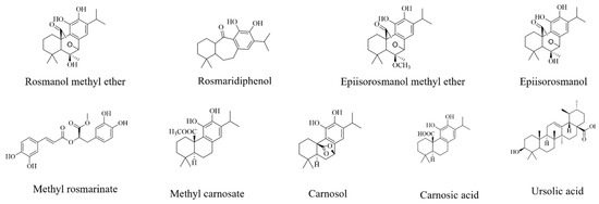 - Jordán, M.J.; Lax, V.; Rota, M.C.; Lorán, S.; Sotomayor, J.A. Relevance of carnosic acid, carnosol, and rosmarinic acid concentrations in the in vitro antioxidant and antimicrobial activities of Rosmarinus officinalis (L.) Methanolic Extracts. J. Agric. Food Chem. 2012, 60, 9603–9608. [Google Scholar] [CrossRef] [PubMed]