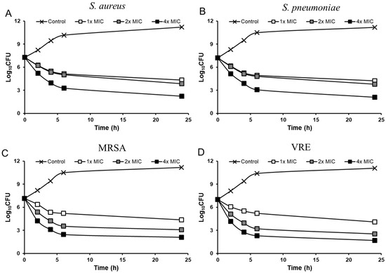 Time-kill analysis was performed by the NCCLS M26-A method [37]. The test organisms (S. aureus Giorgio, S. pneumoniae ATCC49619, MRSA CCARM 3167, and VRE 3) incubated in CAMHB for 18 h at 35 °C were diluted to 105 CFU/mL with fresh CAMHB, and the diluted cultures were preincubated for 2 h. For S. pneumoniae culture, 5% sheep blood (Hanil Comed, Seongnam, Korea) was added. Test compounds were added to the cultures at concentrations of 1×, 2×, and 4× MIC. Culture aliquots (0.1 mL) were removed after 0, 2, 4, 6 and 24 h of incubation, and serial 10-fold dilutions were prepared in saline as needed. The numbers of viable cells were determined on drug-free MHA plates after 20 h of incubation. A compound was considered bactericidal if the original inoculum was reduced by 3 log CFU/mL (99.9%) at each concentration or was considered bacteriostatic if the inoculum was reduced by 0–3 log CFU/mL.