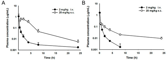 Plasma concentration-time profiles for coralmycin A (A) and DH-coralmycin A (B) in mice after intravenous (i.v.) and subcutaneous (s.c.) administration. The data were examined after i.v. (●) and s.c. (○) injection (mean ± SD, n = 3).