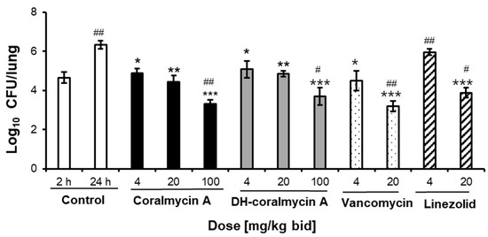 Therapeutic efficacies of coralmycins in a mouse model of respiratory tract infection caused by S. pneumoniae ATCC49619. The MIC values of coralmycin A, DH-coralmycin A, vancomycin, and linezolid against S. pneumoniae ATCC49619 were 0.01, 0.25, 0.5, and 2 mg/L, respectively. CFU in the lungs (n = 4) of vehicle- and drug-treated mice were determined. The experiment shown is representative of two independent trials. Data are expressed as the mean ± SD (n = 4; * p < 0.05, ** p < 0.01, and *** p < 0.001 versus 24 h control; # p < 0.05 and ## p < 0.01 versus 2 h control). p values were obtained using unpaired Student’s t test.