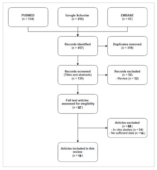 Based on the inclusion criteria, a total of 19 publications treating cases of infection by CR bacteria in patients were selected to conduct this review. Eight series (a randomized controlled trial [24], two retrospective monocentric [25,26], and five case series [26,27,28,29,30]) and eleven case reports published between 2017 and 2021 were included. As shown in Figure 1, the flow diagram reports the results from the literature search and the study selection process.