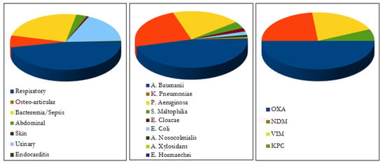 According to our data, the most effective carbapenemases, in terms of carbapenem hydrolysis and geographical spread, are OXA, NDM, VIM, and KPC [8]. Among carbapenem-resistant OXA-type β-lactamase, OXA-23 and OXA-48 were the most recurrent. The most dominant groups of Metallo-β-Lactamases (MBLs) were NDM and VIM. Cases of KPC have also been reported, frequently associated with Klebsiella Pneumoniae.
