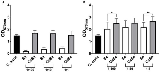 Staphylococcus aureus does not influence biomass of dual-species biofilms. Biofilms were grown in growth media at varying ratios of bacteria to fungi. The concentration of C. auris (Ca) remained constant at 1 × 106 cells/mL whereas S. aureus (Sa; A) and S. epidermidis (Se; B) were added to growth media at final concentrations of 1 × 104, 1 × 105 and1 × 106 cells/mL. Ratios provided below the x-axis indicate the number of bacterial to fungal cells. Biofilms were washed with PBS and stained with crystal violet before measuring the absorbance of bound dye at 570 nm. Experiments were performed in triplicate and error bars represent the standard deviation of the mean (*; p < 0.05 **; p < 0.01).