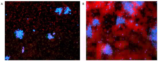 Development of a Candida auris dual-species biofilm. Images captured of 24 h dual-species biofilms containing C. auris with S. aureus (A) and S. epidermidis (B). Biofilms were stained using 1.5 mM calcofluor white and 1.5 mM hexidium iodide for 1 h to visualise fungi (blue) and bacteria (red). Calcofluor white and hexidium iodide were fluoresced at excitation/emission wavelengths of 357/447 and 531/593 nm, respectively.